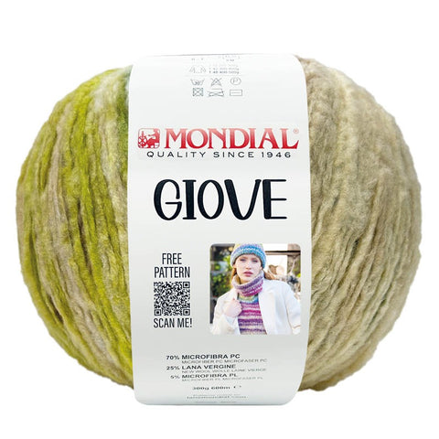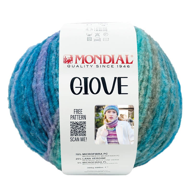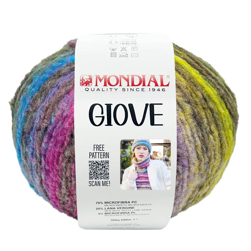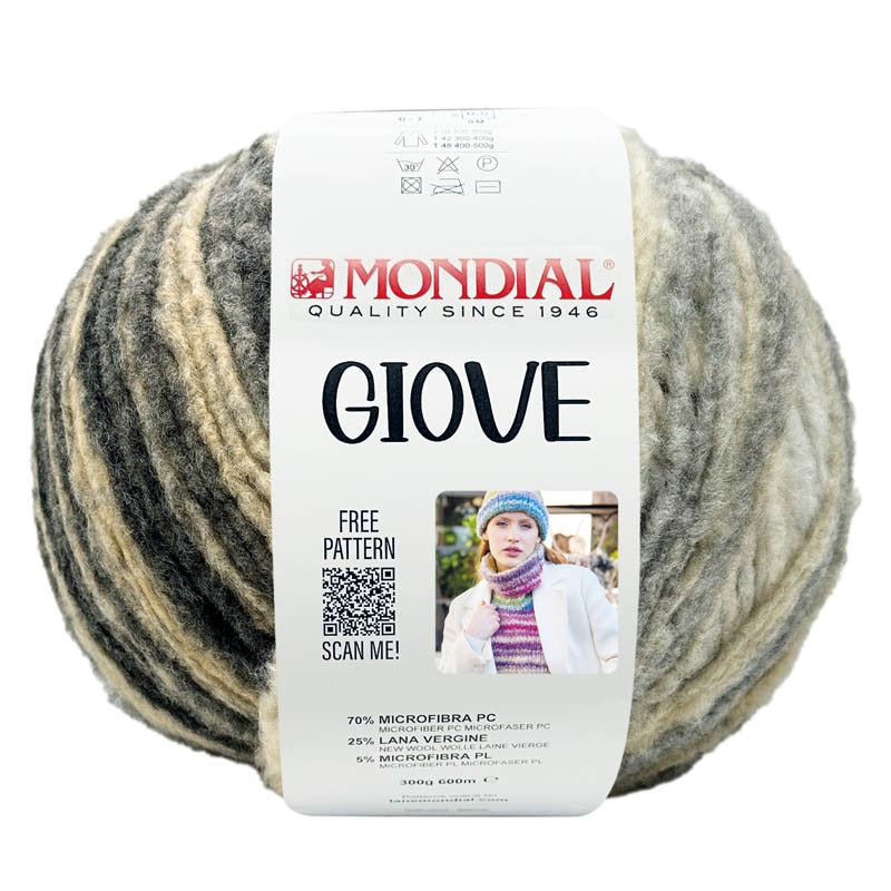 Giove se presenta en una madeja de 300 g con forma de rosquilla y gracias a su excelente metraje, una sola madeja es suficiente para crear accesorios como chaquetas interiores, gorros y bufandas extragrandes ultraabrigadas.