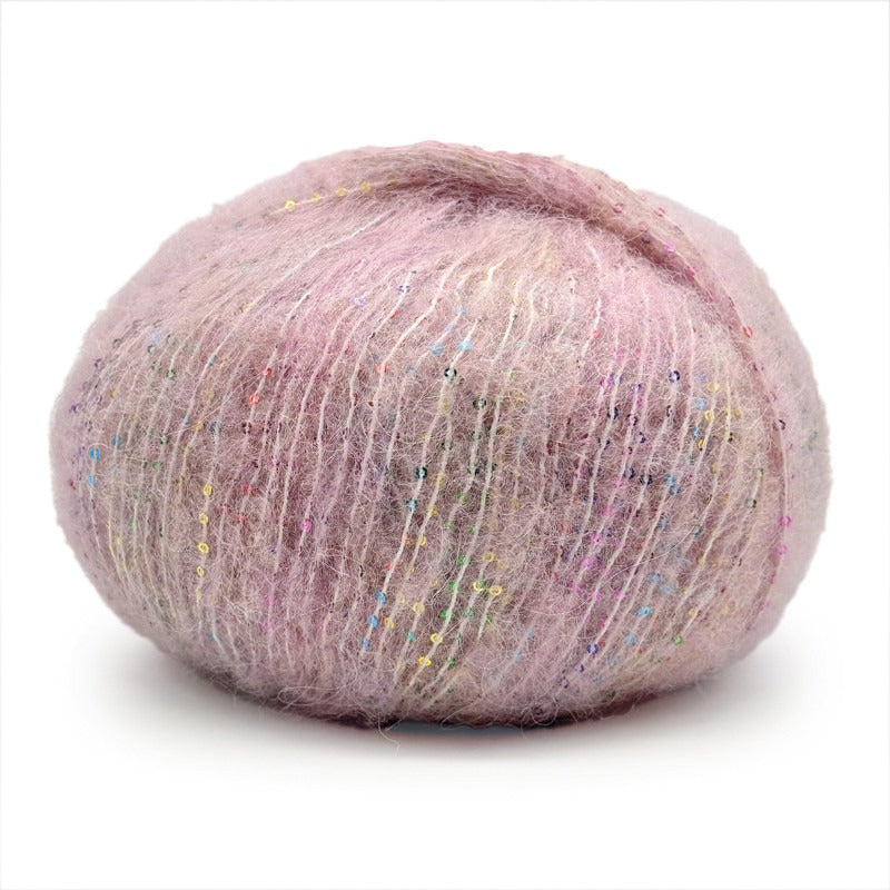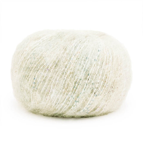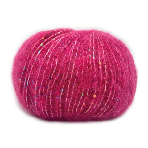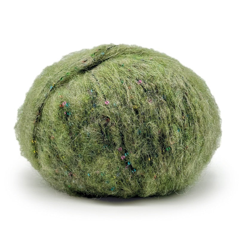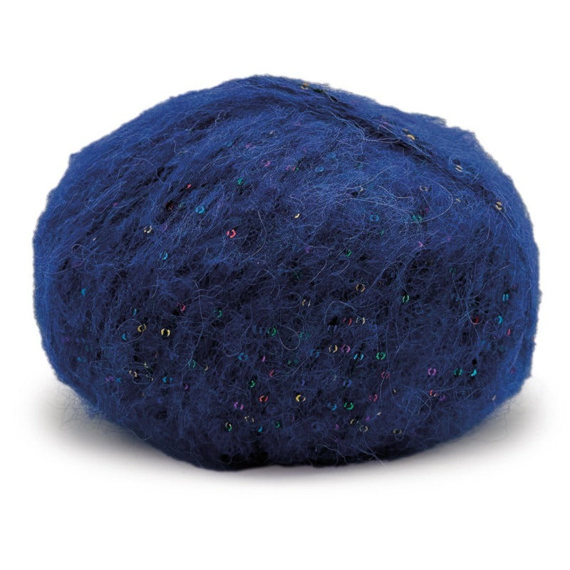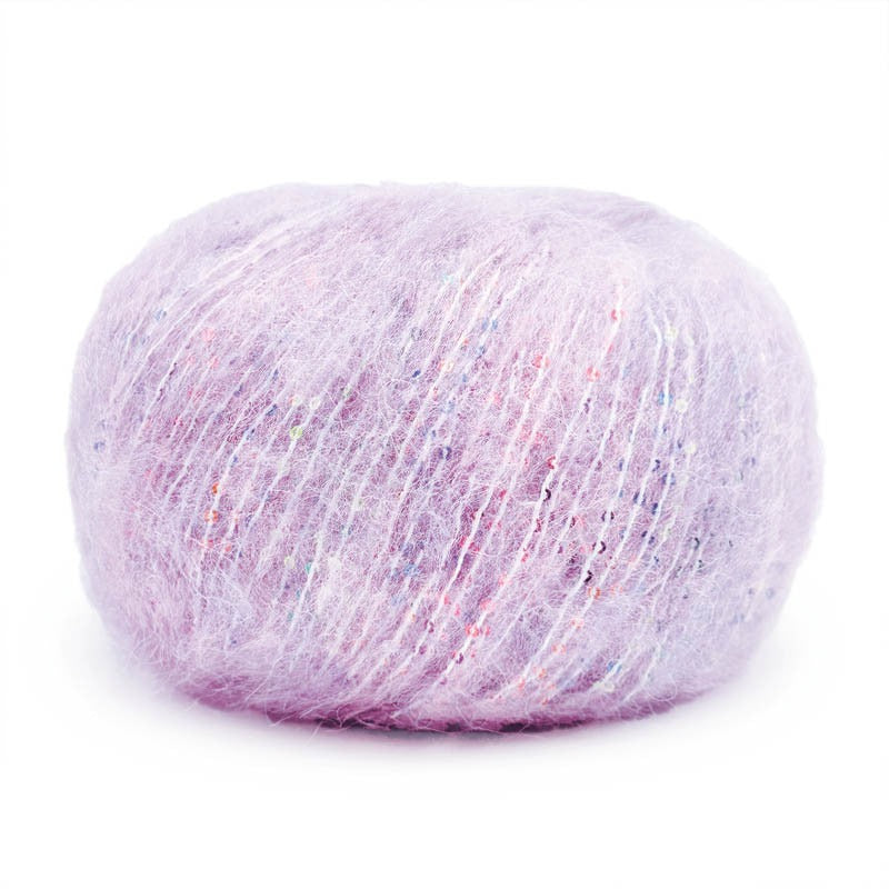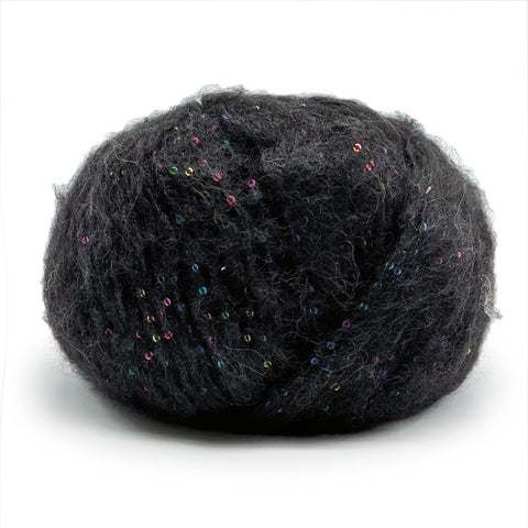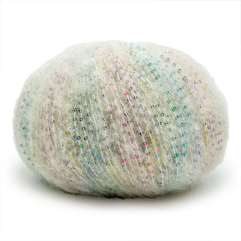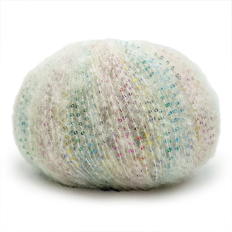 Una auténtica joya para expertos: un hilo cálido, ligero y elegante, fruto de la unión de un fino vellón de alpaca y un componente rico en lentejuelas multicolor.